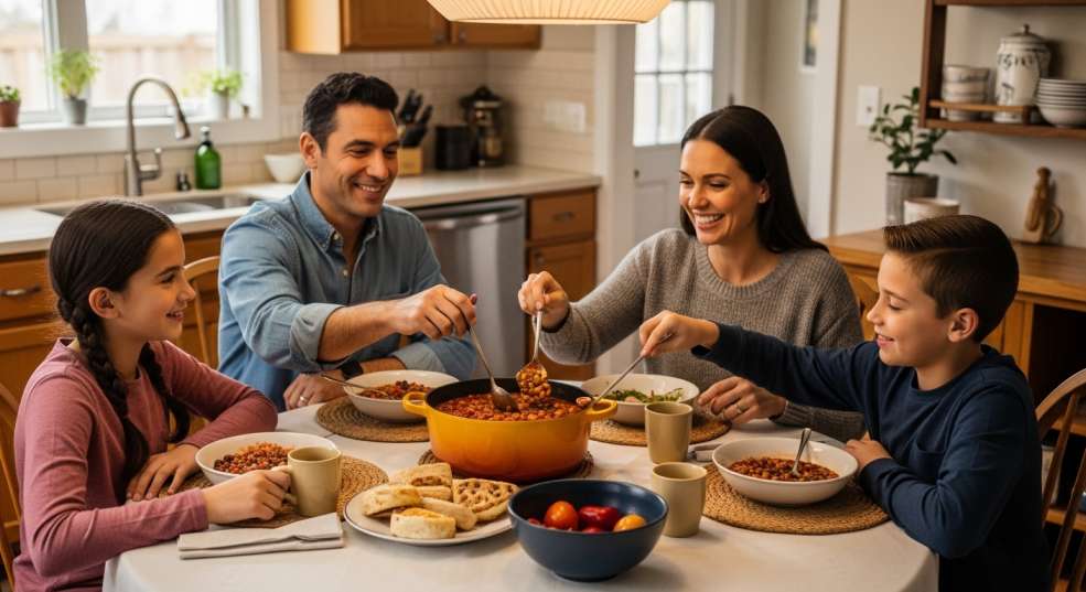Canadian family enjoying a cheap and healthy budget dinner together at home.